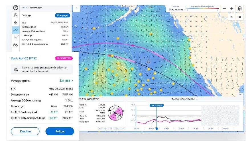 Wayfinderは、海洋観測ブイの情報を基にした気海象予測、船の燃費性能、航行制限海域などの制約条件をリアルタイムで反映し、安全運航・効率運航に最適なエンジン回転数・航路を毎日 各船および陸上の運航担当者に提供します。