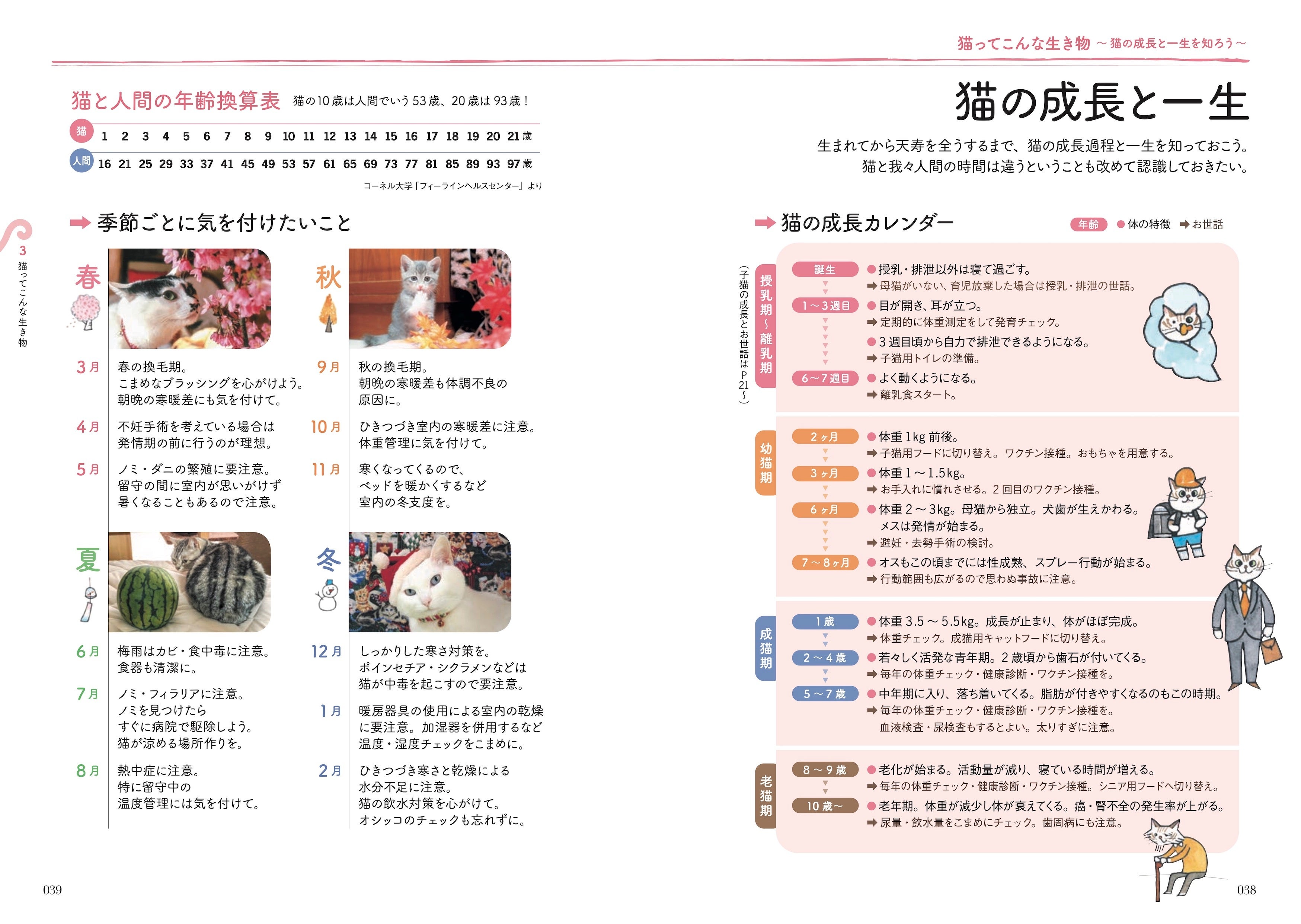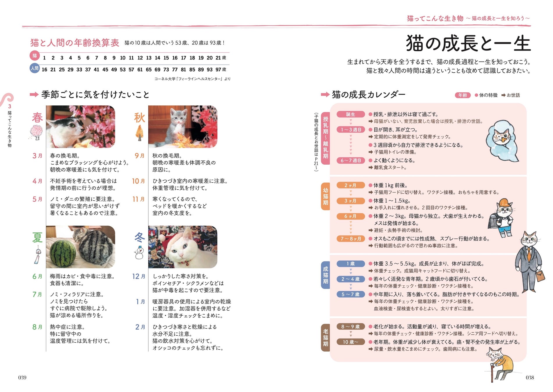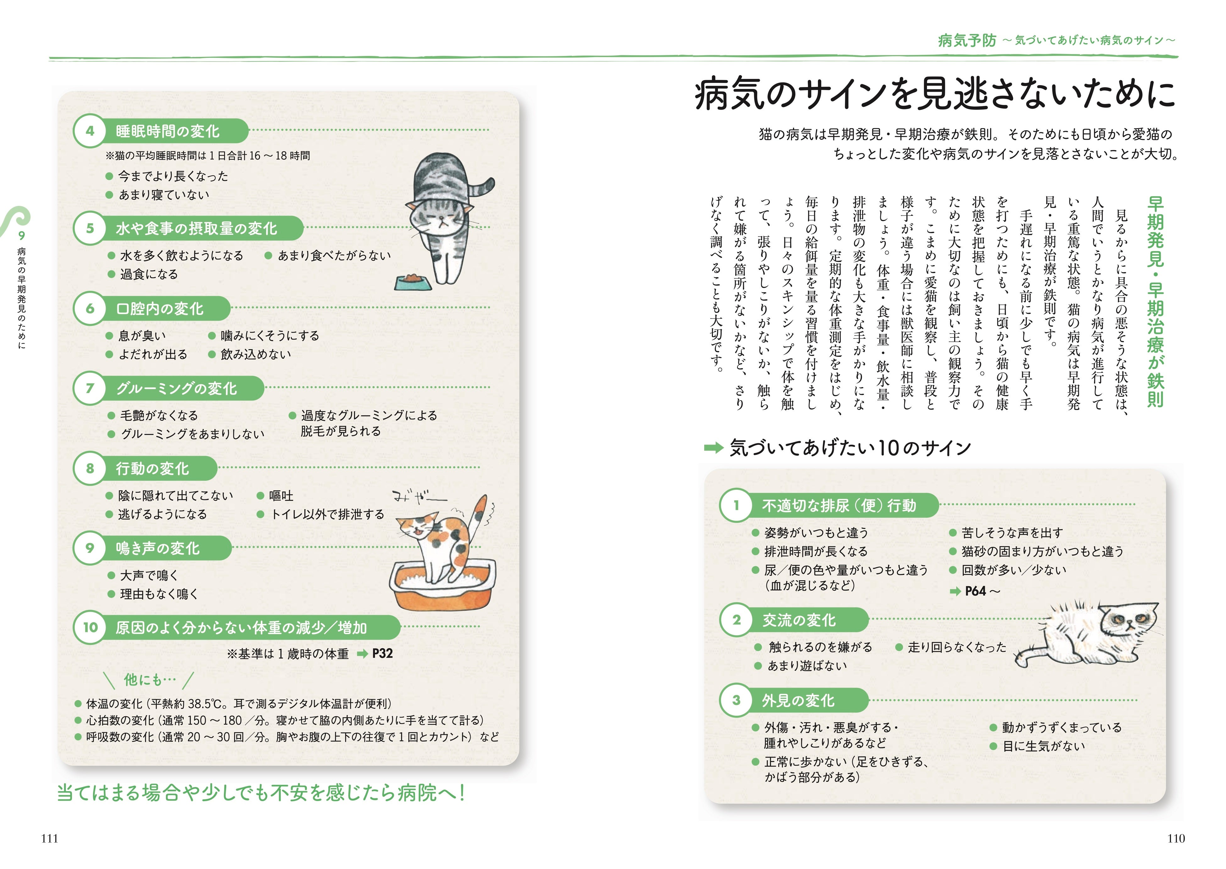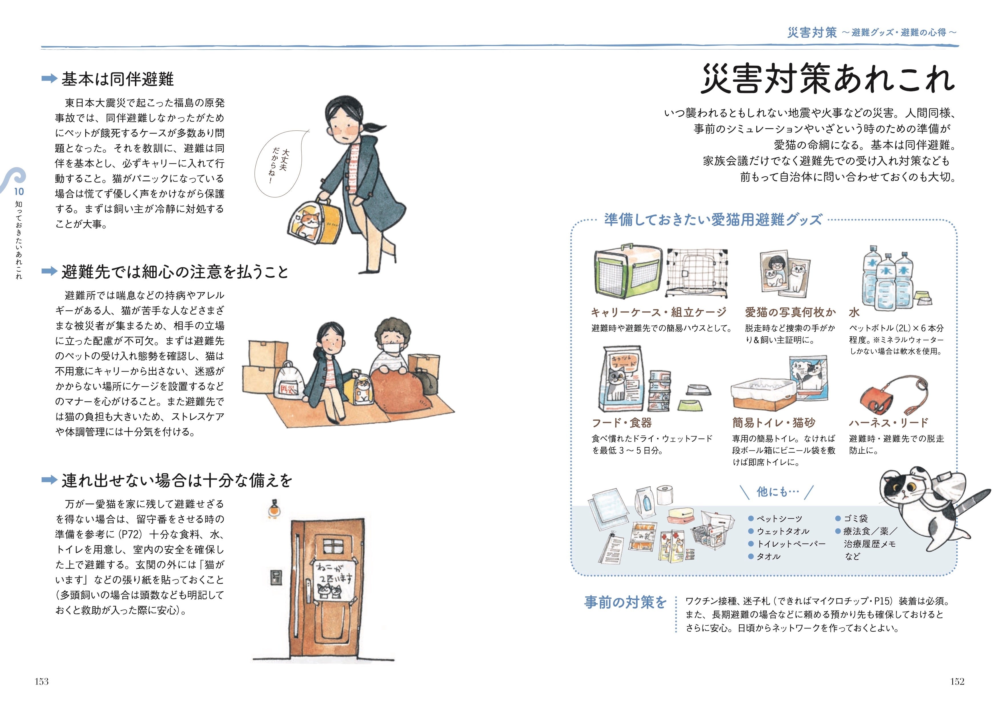 さらには腎不全や猫エイズなど猫の病気の基礎知識、病気の早期発見のために日頃から注意すべきポイントなどもわかりやすく解説。ヤケドや熱中症などの緊急時の応急処置や、地震などの災害時の同行避難といった、非常事態の対応や備えについてもページを割いています。