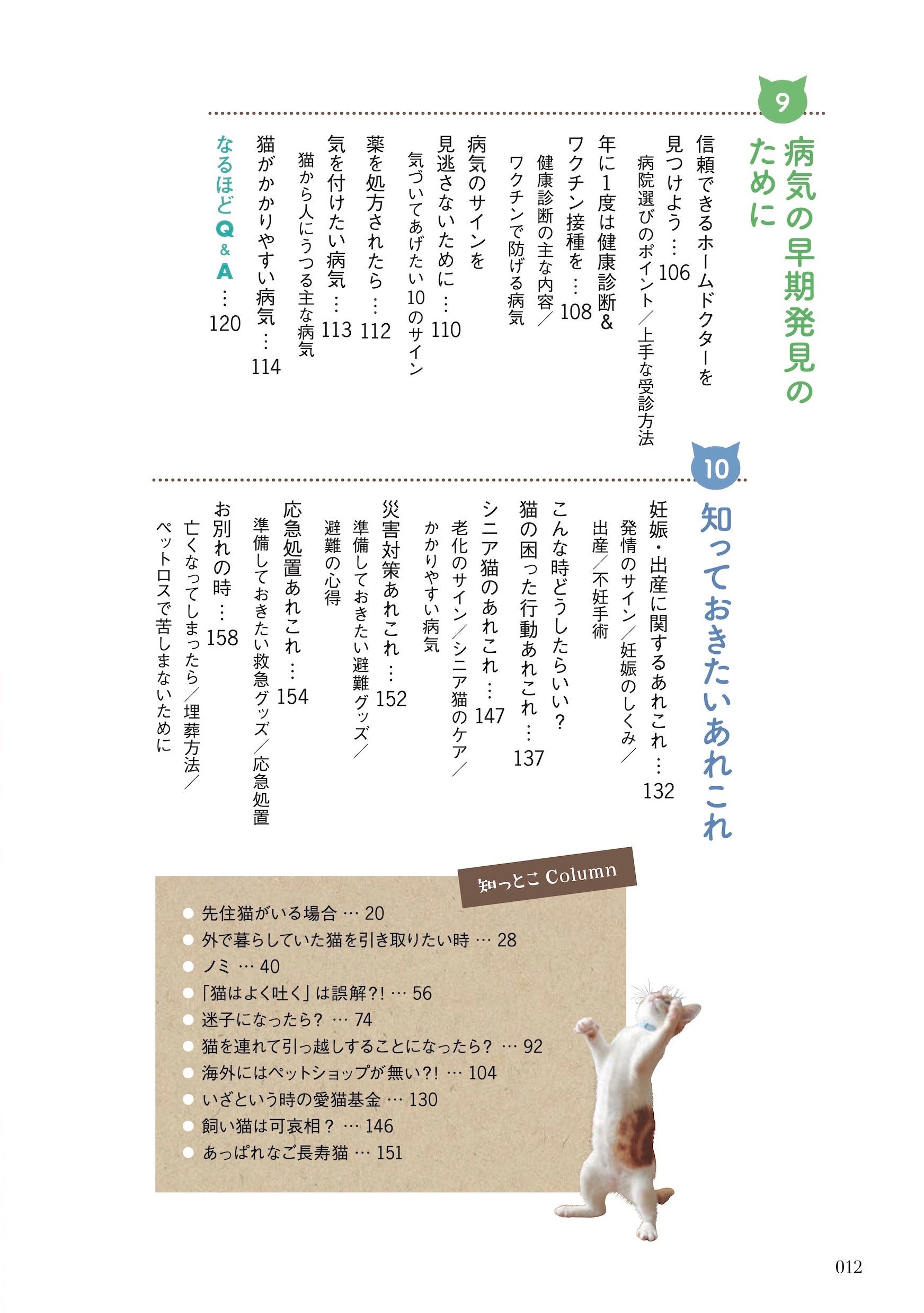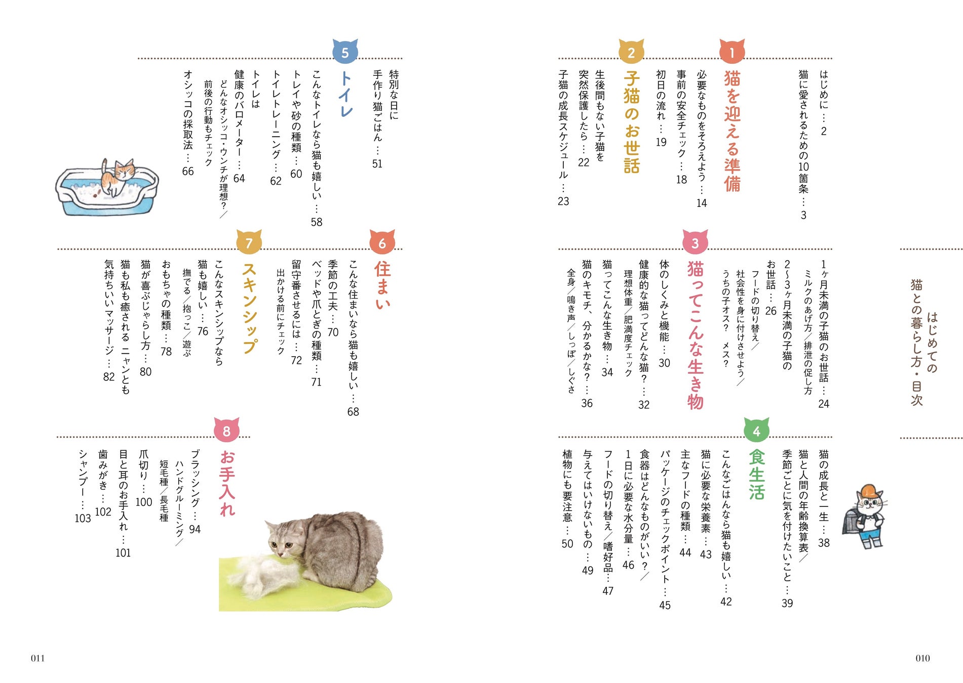 食事やスキンシップなどの日常生活から、安全で快適な住まいの整え方、上手な遊ばせ方やお手入れなど、猫との暮らしをよりよくするためのあらゆる項目が網羅されています。