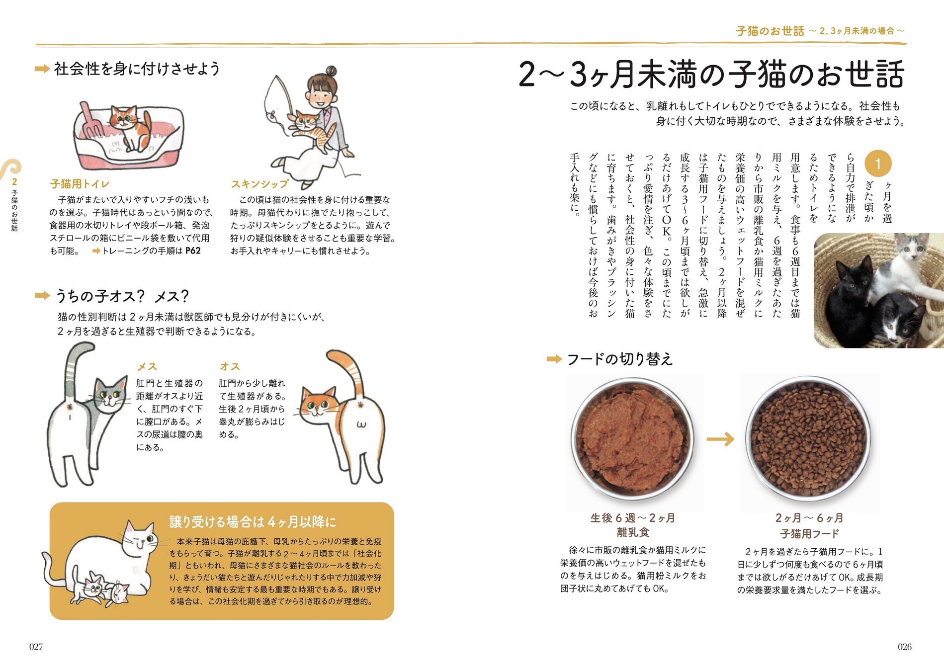 この本は、単に猫のマニュアル的な飼い方を解説しただけの飼育書ではありません。猫の生態やいろいろな行動の理由も説明することで、はじめて猫を飼う人でも猫がどのような動物かがわかる構成になっています。より猫を好きになってもらい、よりしあわせな関係を築いてもらうためです。