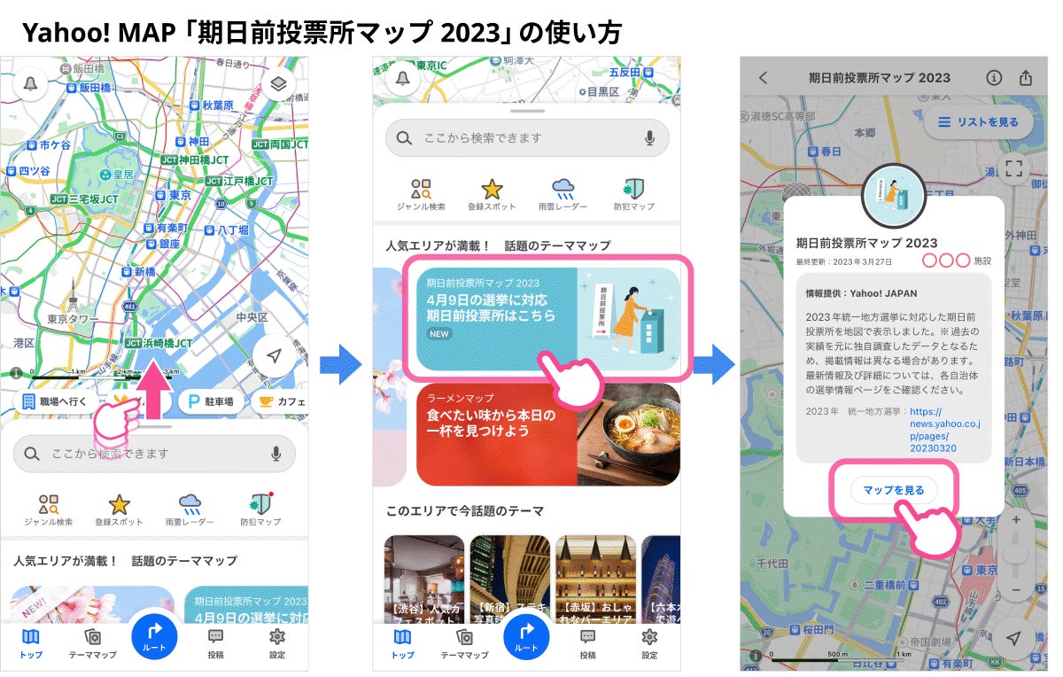 ~ Yahoo! MAPアプリ「期日前投票所マップ 2023」では、全国の期日前投票所がワンタップで確認可能、各投票所がどの選挙に対応しているかラベルで表示 ~