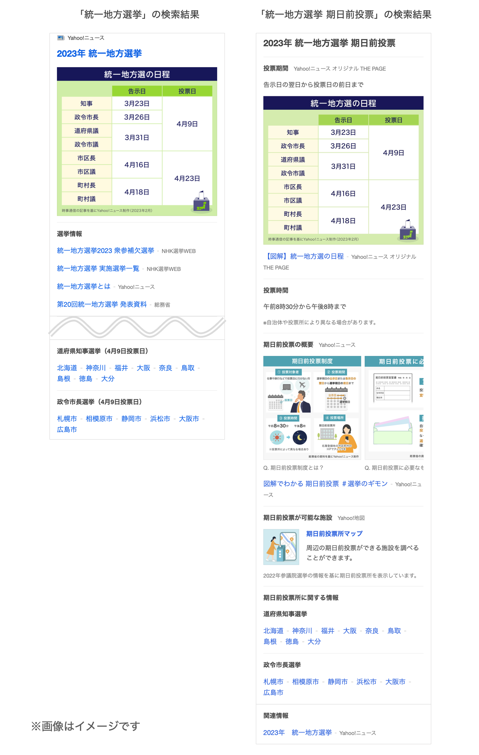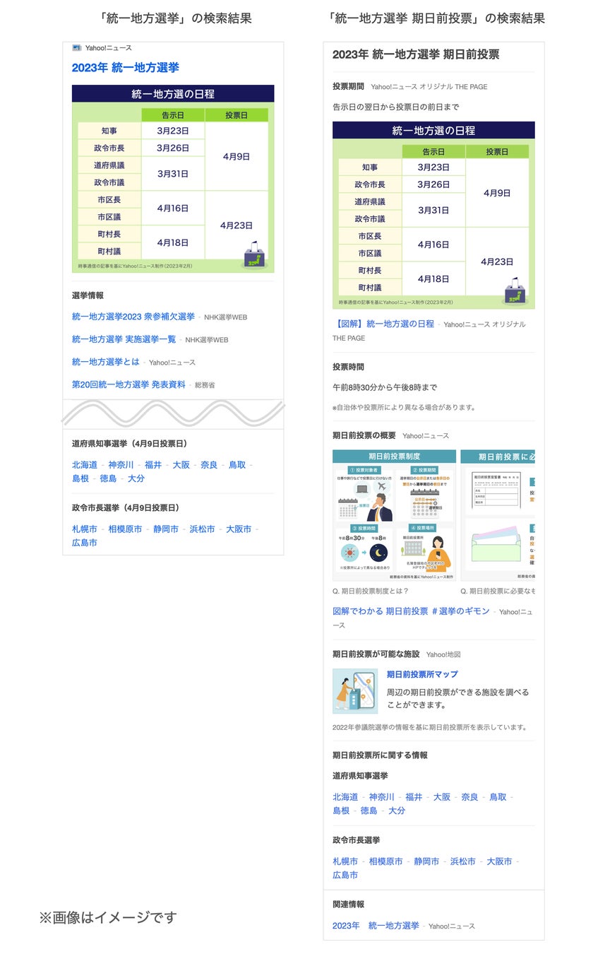 「Yahoo!検索」では、「統一地方選挙」と検索すると、2023年統一地方選挙の日程や関連ニュースなどを、「統一地方選挙 期日前投票」と検索すると、期日前投票の日程や投票所など、投票に役立つさまざまな情報をわかりやすく表示しています。(※1)