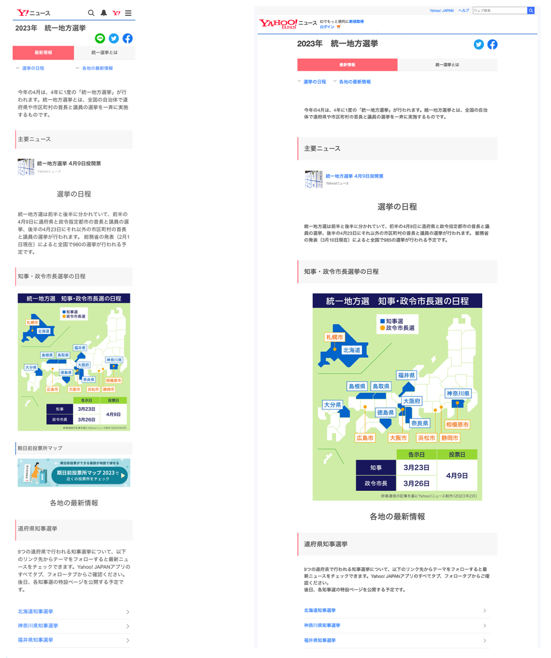 「Yahoo! JAPAN」アプリ(iOS版、Android版)、「Yahoo! JAPAN」(スマートフォンブラウザー版、PC版)では、2023年統一地方選挙に関するさまざまな情報や4月9日に投開票される各地の知事選、政令市長選の最新情報を紹介する「2023年統一地方選挙」特設ページを開設しています。(※3)