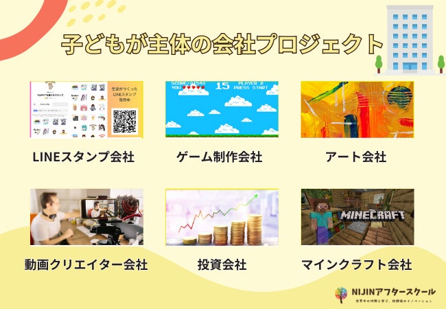 NIJINアフタースクールは小中学生を対象としたオンライン学童で、放課後子どもたちが自宅から全国・世界と繋がります。メタバースの中で会社をつくり、自分や社会をハッピーにする「会社プロジェクト」に参画。住む場所も年齢も異なる友達や社会で活躍する大人たちと関わり「実社会で活きる創造性や協働性」を身につけることができます。「会社プロジェクト」では子どもたちが主体でプロジェクトを進行し、世の中にどんな問題があるか、何が求められているか、社会人と関わりながら社会を知ることができます。