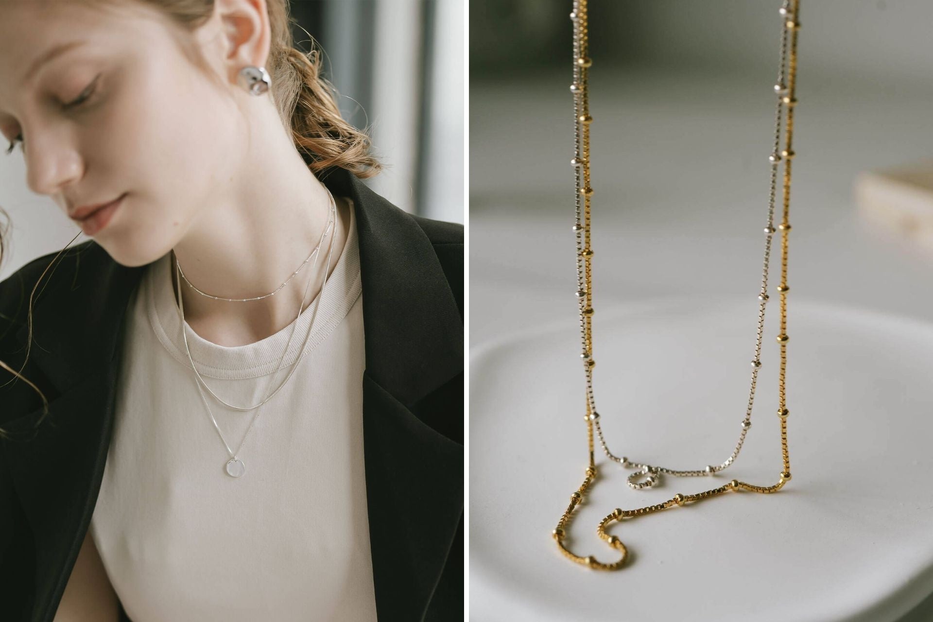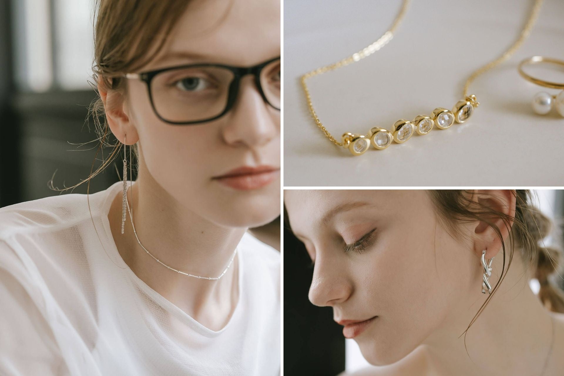 この春新たに登場したのは、透明感あふれる天然石をあしらったシルバーネックレス、首元をすっきりと見せるチョーカーネックレス、そして軽やかに揺れるチェーンピアス。