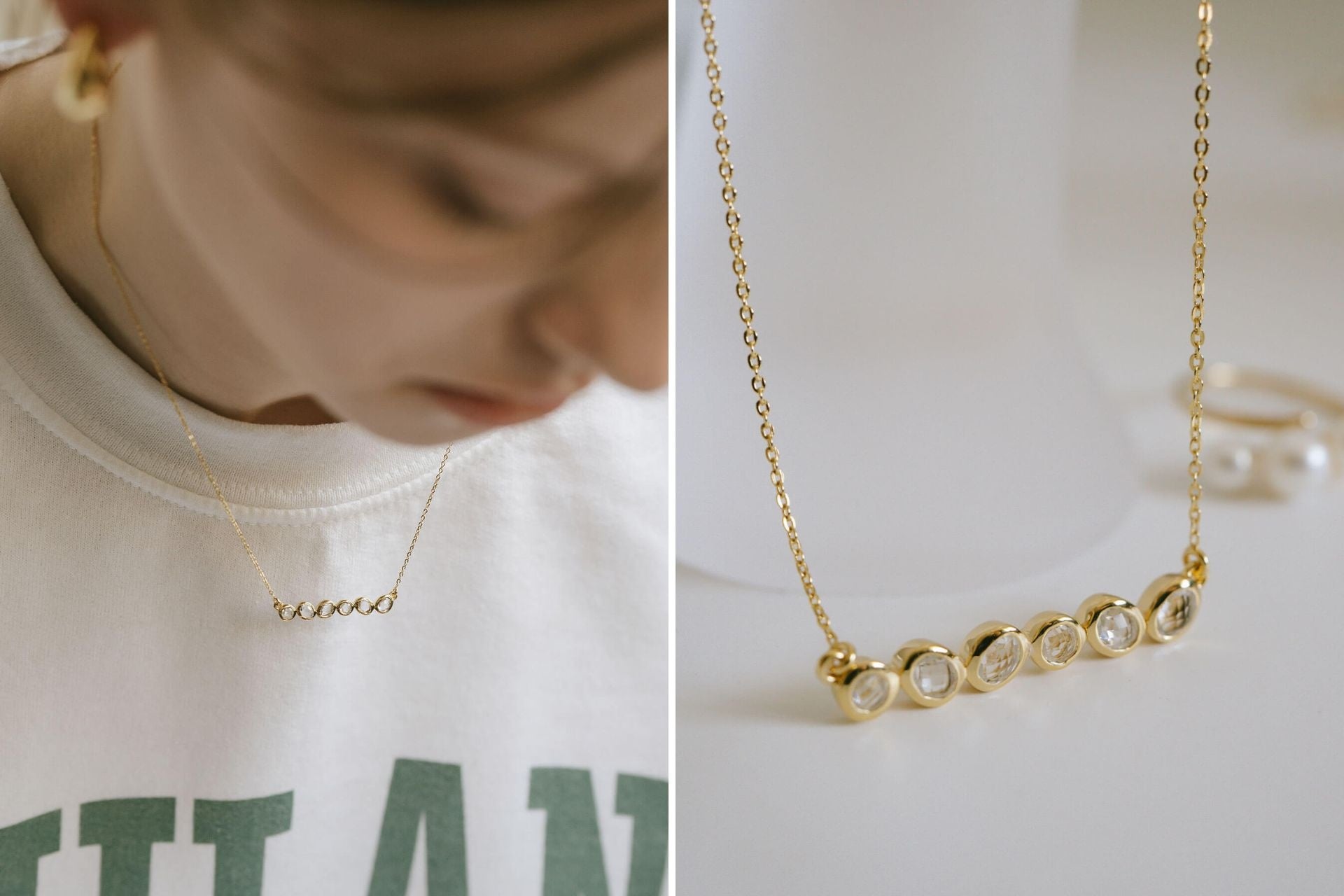 透明感のあるホワイトクォーツを6石並べた、洗練されたバーデザインのネックレス。シンプルながらも印象に残る上品な佇まいで、装いにさりげない輝きを添えます。
