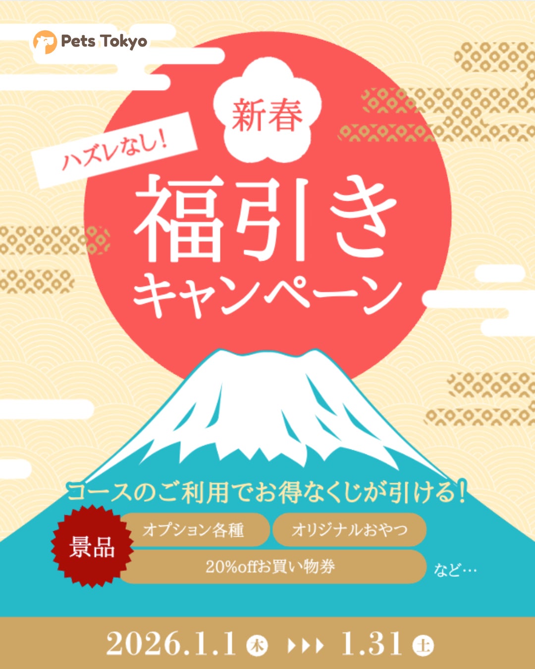 Pets Tokyo幡ヶ谷店では1月1日〜1月31日まで、日頃のご愛顧に感謝を込めて、豪華景品が当たる「新春福引きキャンペーン」を開催いたします。トリミングや20%offお買い物券などお得が盛りだくさんの内容となっております。