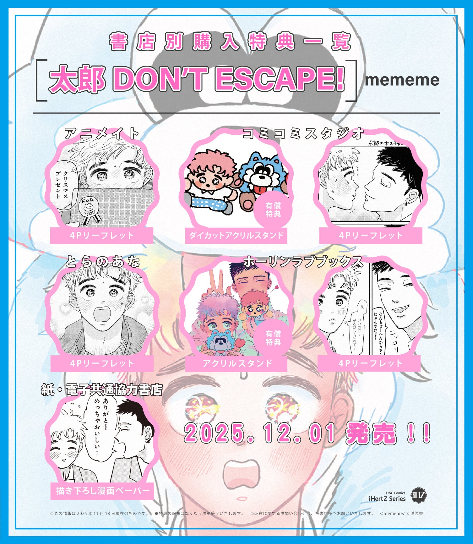 2025年12月1日、大洋図書(H&C Comics iHertZシリーズ)より発売されたBLコミック『太郎 DON’T ESCAPE!』(著:mememe)