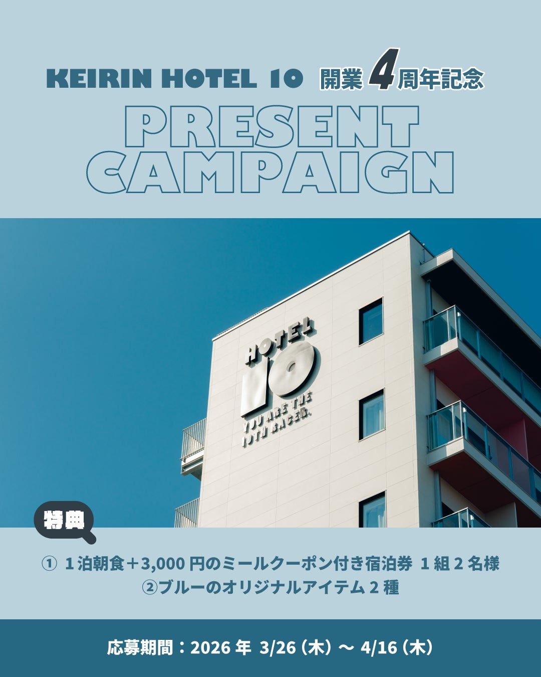 開業4周年を記念し、KEIRIN HOTEL 10の公式Instagramアカウントにて、フォロワーを対象としたプレゼントキャンペーンを実施いたします。