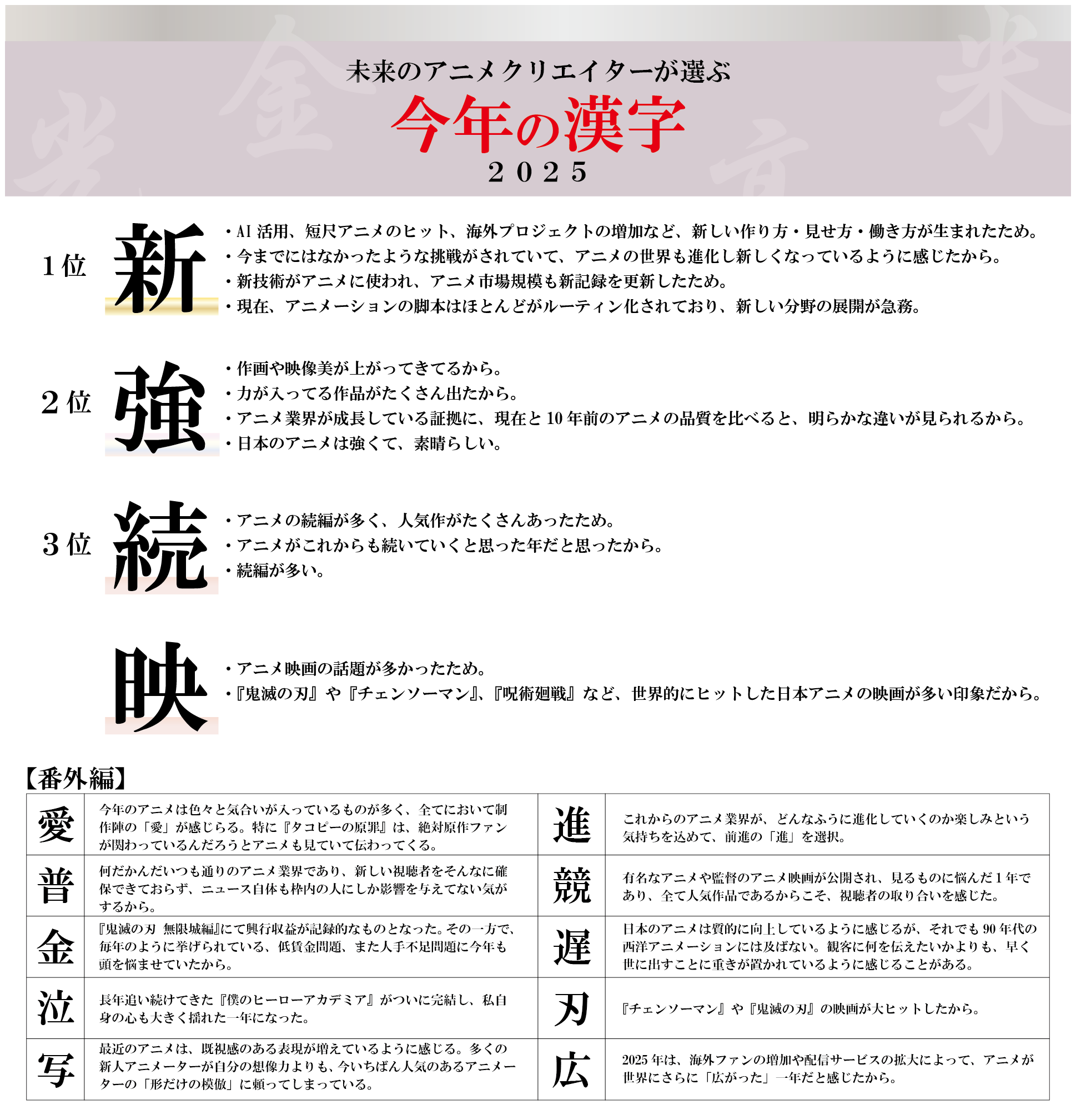 アニメ業界「今年の漢字」は【新】!印象に残ったニュース第1位は…。未来のアニメクリエーター100名が選ぶアニメ大賞2025【東京クールジャパン・アカデミー】