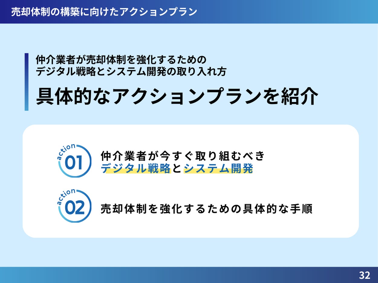 本レポートでは、不動産売却体制の強化に必要なデジタル戦略とシステム開発を活用したアクションプランについても解説しています。