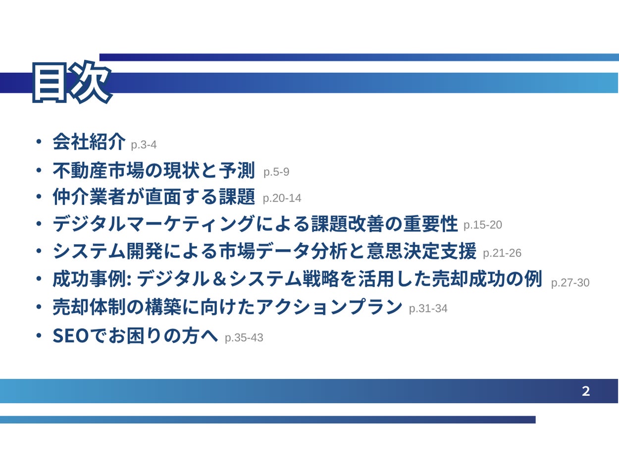 アクションプランを通じて、仲介業者が競争力を高め、売却成功を目指すための方法や、SEO対策による売却物件の検索順位向上についても紹介しています。