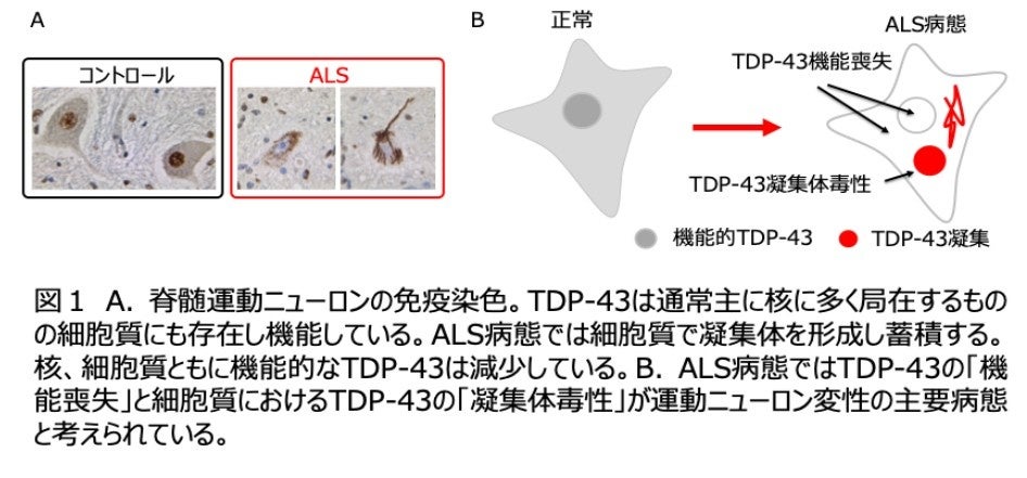 ALS患者の多くは中高年以降に特別な誘因や前兆もなく発症します。病初期は限られた領域の筋力低下に留まりますが、徐々に全身の筋力が低下し、平均3〜5年で呼吸筋麻痺のために自力での呼吸ができなくなります。現在使用可能なALS治療薬は進行を遅らせる効果はありますが病態抑止効果は十分とは言えません。ALS患者の9割以上は血縁者に同様の患者がいない孤発性であり、発症原因が特定されていません。しかし亡くなったALS患者さんの脳や脊髄の病理学的・生化学的解析から、ALSの運動ニューロンでは本来核に存在するTDP-43というタンパク質が核から脱出し細胞質に凝集体を形成することがわかってきました(図1)。また、認知症の一つである前頭側頭葉変性症(FTLD)の約半数では、ALS同様のTDP-43病理を変性ニューロンに認め、ALSとFTLDが合併する症例も一定程度みられます。ALS病態では、TDP-43の「機能喪失」と「凝集体毒性」がニューロン死の主要因と考えられています。ALSにおけるTDP-43異常を正常化できれば良いわけですがTDP-43がこのような異常を来す原因が特定できていないため、現状では「TDP-43の機能を補う」ことと、「凝集体を減らす」ことが現実的な治療戦略となります。