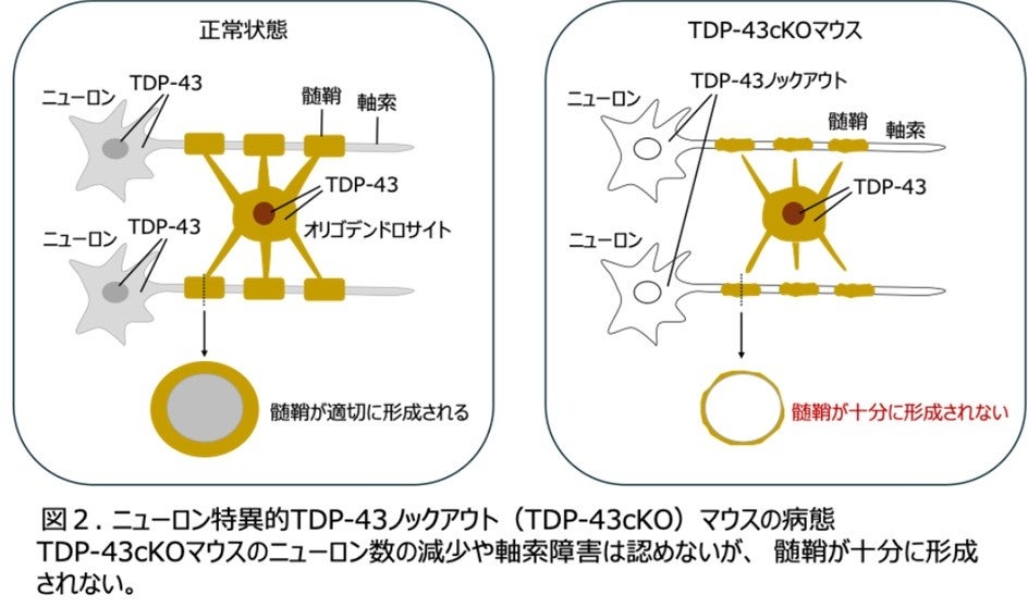・神経細胞(ニューロン)特異的にTDP-43*1をノックアウト*2したマウスの脳において軸索*3の髄鞘化*4が抑制されていることを発見