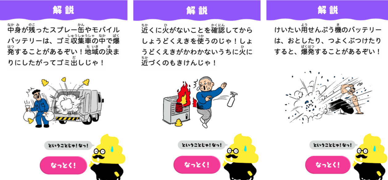 年間1,000件を超えると言われる、爆発や発火といった日常生活で発生する事故。身の回りの製品の正しい使い方を子どもが学ぶことで、そんな事故を未然に防ぐために生まれたクイズ形式のオンラインゲームです。