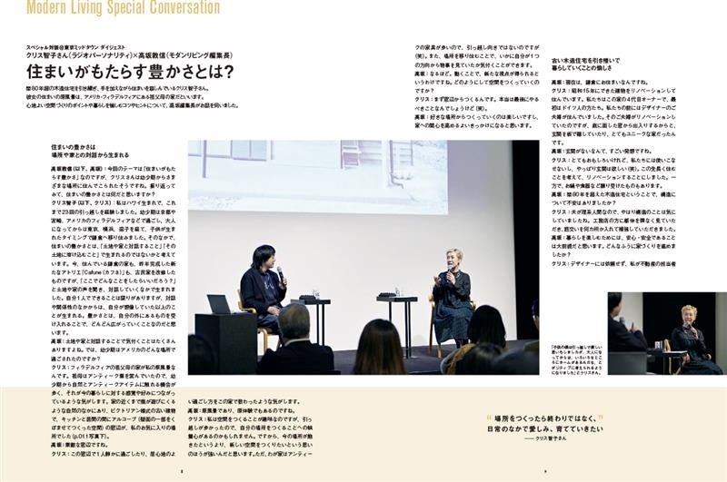 巻頭特集はクリス智子さんと『モダンリビング』編集長の、「木の家と暮らしの愉しみ」についてのスペシャル対談です。