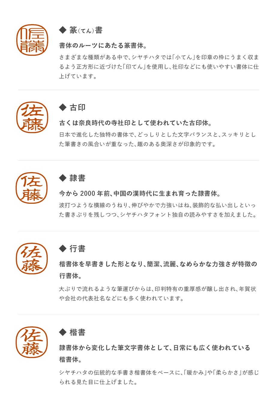 書体:篆(てん)書、古印、隷書、行書、楷書