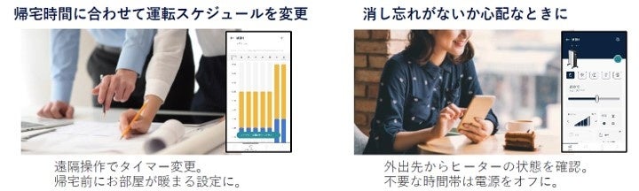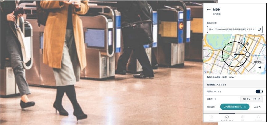 GPSで位置情報によりヒーターを操作。自宅に近づくと電源がオンに。自宅から離れるとオフにもできるので、消し忘れの心配もなくなります。