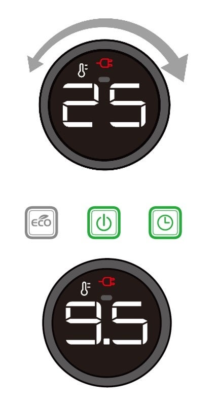 時計回りに回すと設定温度は高く、反時計回りに回すとと設定温度は低くなります。温度は5℃および10~28℃の間で設定可能です。