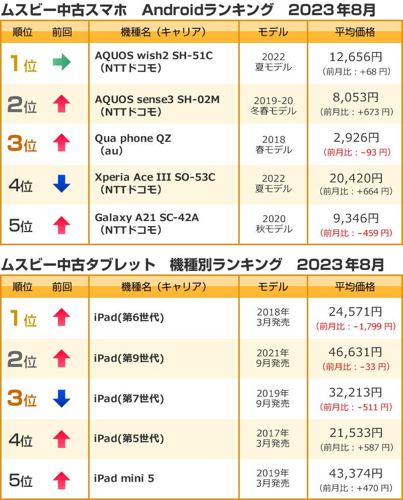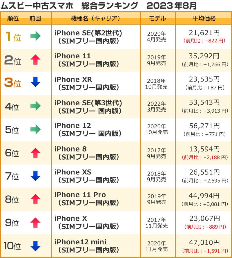 ムスビー/2023年8月の中古スマホ取引数ランキング