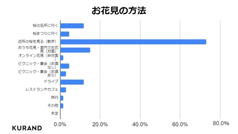 桜の名所に行く 11.9%、桜まつりに行く 4.5%、近所の桜を見る(散歩) 73.1%、おうち花見・室内でお花見(対面)14.9%、オンライン花見(非対面) 1.5%、ピクニック・宴会(お酒なし) 4.5%、ピクニック・宴会(お酒あり) 3.0%、ドライブ 11.9%、レストランやカフェ 3.0%、旅行 1.5%、その他 1.5%、未定 34.3%