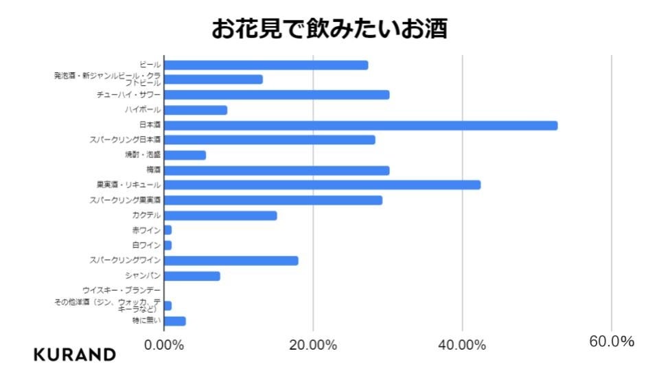 お花見で飲みたいお酒を聞いたところ、最も多かったのは「日本酒」で52.8%でした。次に多かったのは「果実酒・リキュール」の42.5%、「チューハイ・サワー」と「梅酒」が30.2%という結果になりました。