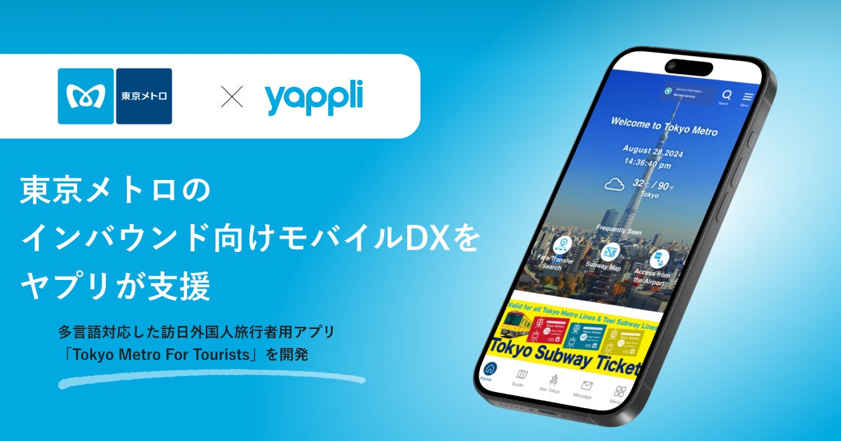 アプリプラットフォーム「Yappli(ヤプリ)」を提供する株式会社ヤプリ(本社:東京都港区、代表取締役:庵原保文、以下「ヤプリ」)は、東京地下鉄株式会社(本社:東京都台東区、代表取締役社長:山村 明義、以下「東京メトロ」)が運営する、訪日外国人旅行者用アプリ「Tokyo Metro For Tourists」を開発支援したことをお知らせします。
