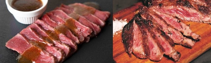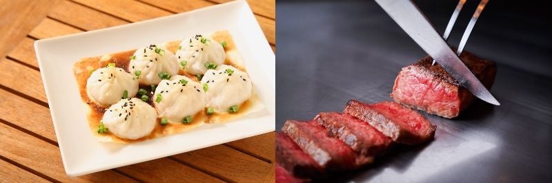 左:牧草牛ステーキ トリュフソース <肉塊UNO >