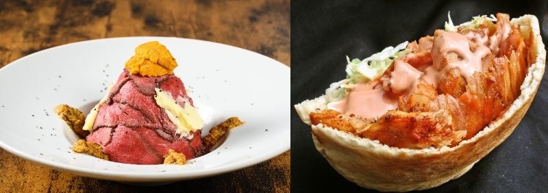 左:北海道バターのローストビーフ丼ウニのせ<金獅子精肉店>
