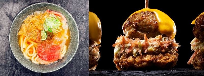 右:六本木肉タワー ハンバーグ on THE メンチカツ with プルドポーク <格之進>