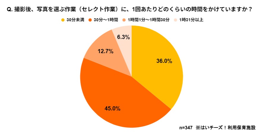 その後の写真選定作業については、64.0%の保育施設が「1枚ずつ確認しながら選ぶのに30分以上かかる」と回答しており、現場にとって大きな業務負担になっていることが明らかになりました。