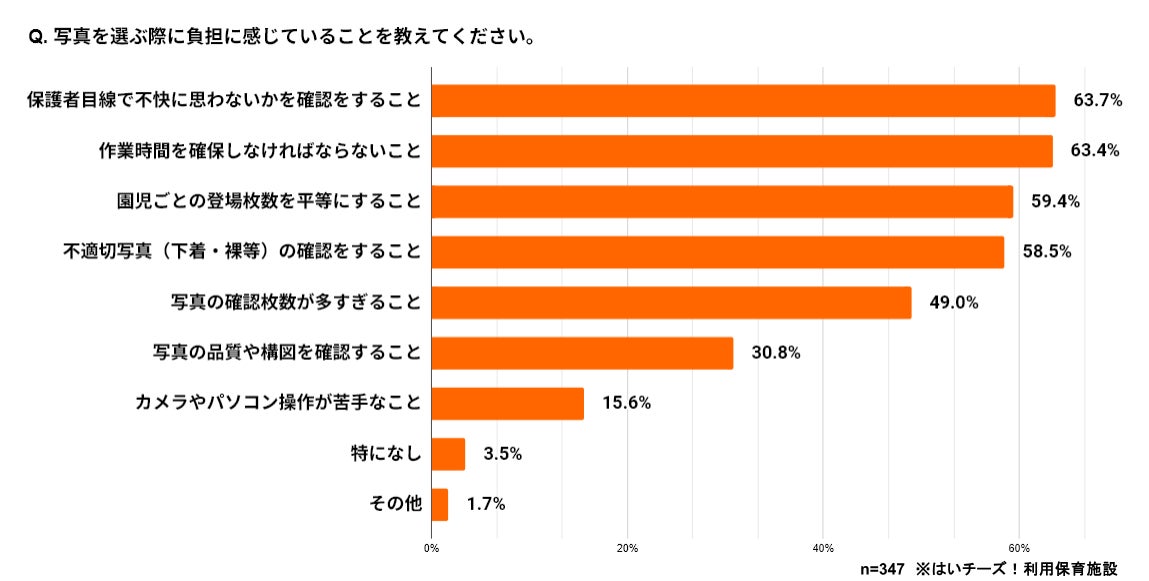 写真選定における具体的な負担として「保護者目線で不快に思わないかを確認すること(63.7%)」、「作業時間を確保しなければならないこと(63.4%)」の2点が最も多く挙げられました。