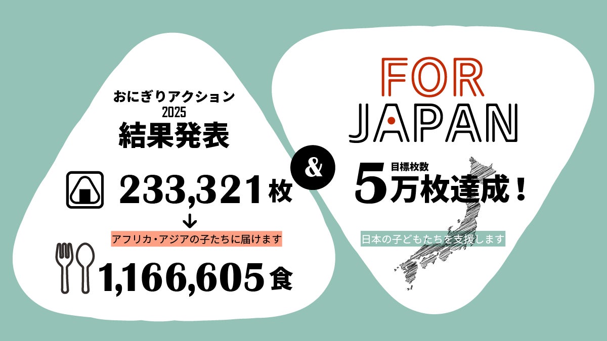 日本発、世界の食料問題の解決に取り組む、特定非営利活動法人TABLE FOR TWO International(以下、TFT)は、国連が定めた10月16日「世界食料デー」(世界中の人が食べ物や食料問題について考える日)を記念し、「おにぎりアクション2025」を本年10月7日(火)から11月15日(土)まで開催しました。40日間で合計23万3,321枚のおにぎり写真が投稿され、アフリカ・アジアの子どもたちに116万6,605食を届けることができることをお知らせします。また、特別企画として、「おにぎりアクション FOR JAPAN」を11月18日(火)から11月30日(日)まで開催しました。5万枚の投稿を達成し、日本の子どもへ食の支援を届けることが決定しました。