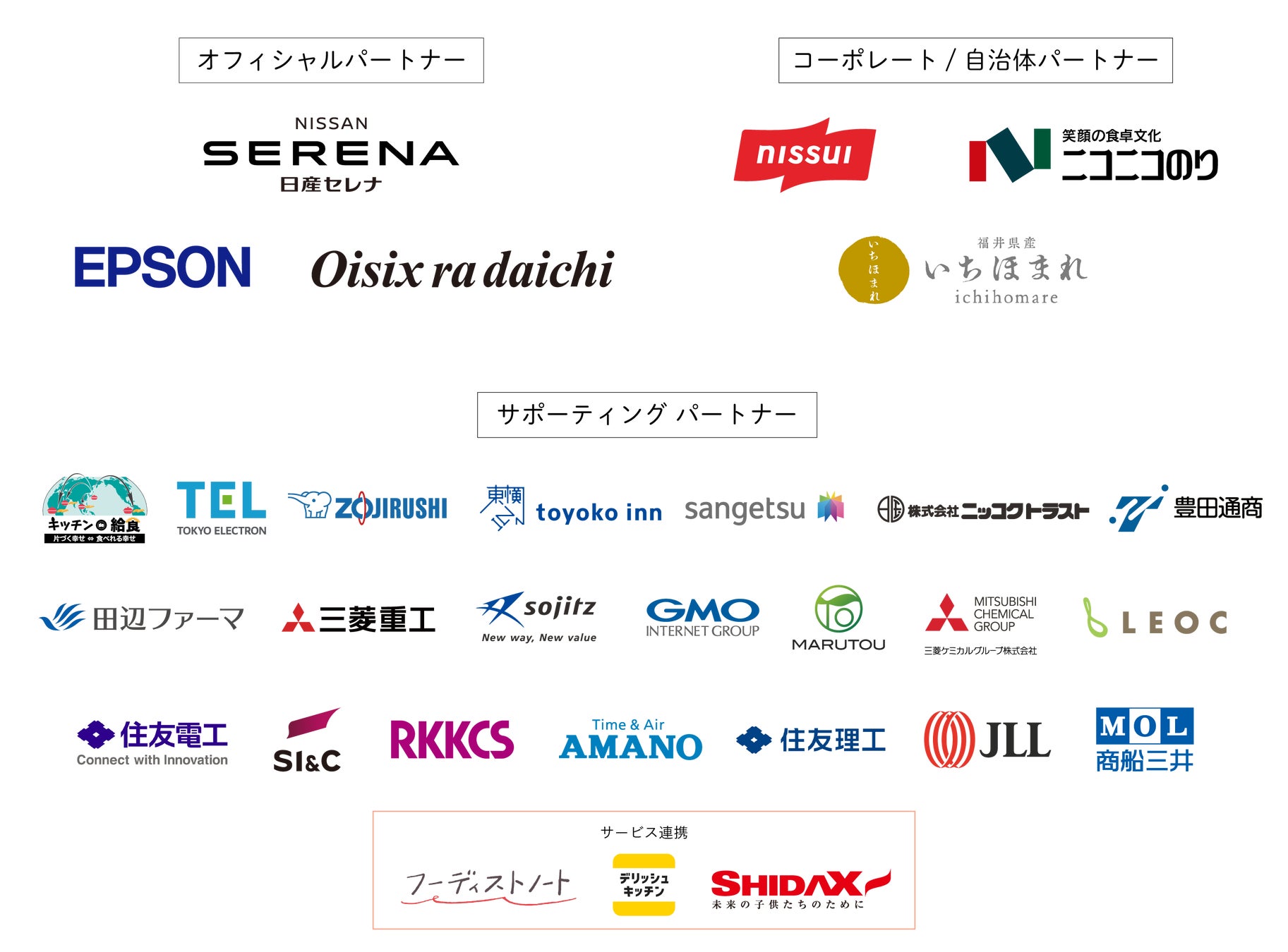 サポーティングパートナー:キッチンde給食、東京エレクトロン、象印マホービン、東横イン、サンゲツ、ニッコクトラスト、豊田通商、田辺ファーマ、三菱重工業、双日、GMOインターネットグループ、丸東、三菱ケミカルグループ、LEOC、住友電気工業、SI&C、RKKCS、アマノ、住友理工、ジョーンズ ラング ラサール、商船三井、フーディストノート、デリッシュキッチン、シダックスコントラクトフードサービス