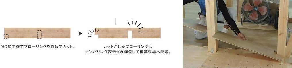 さらに、技能を要する工程を省略できるため、熟練の大工職人でなくても施工可能となる他、施工者の技術に左右されずに一定の施工品質を維持することができます。 加えて、予備材や端材が現場に搬入されず、現場におけるフローリングの産廃発生量を約 80%(年間 108.9 ㎥)削減されます。これは杉の木217.8本分(※2)に相当します。