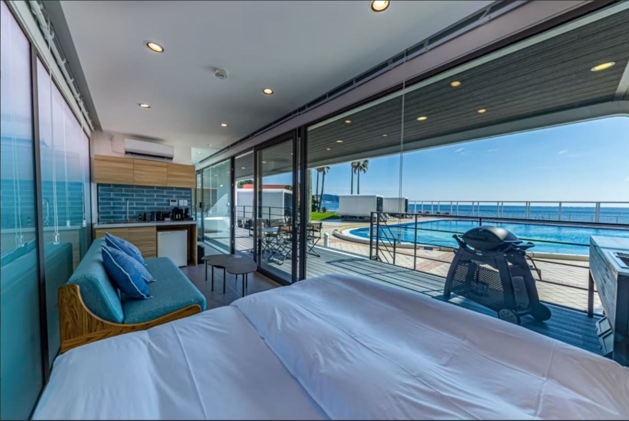 都心から約60分、古都鎌倉からも約10分で、湘南の海と富士山を望む絶景のロケーションを誇る、マリーナリゾート「リビエラ逗子マリーナ」に2022年7月オープン。日本初、近未来デザインのトレーラーホテルの客室スペースは、1日4組限定で海の移ろう情景とともに過ごす、新たなLUXURY STAYを提案しています。