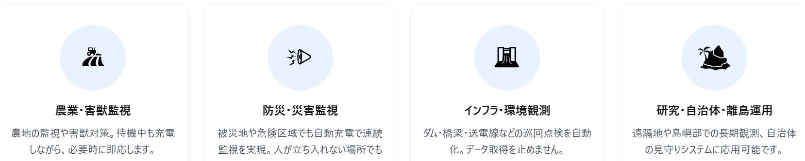 これにより、自動充電による連続運用や、屋外環境への対応、安全性の向上などを実現し、ドローン運用の自動化・省人化に貢献します。