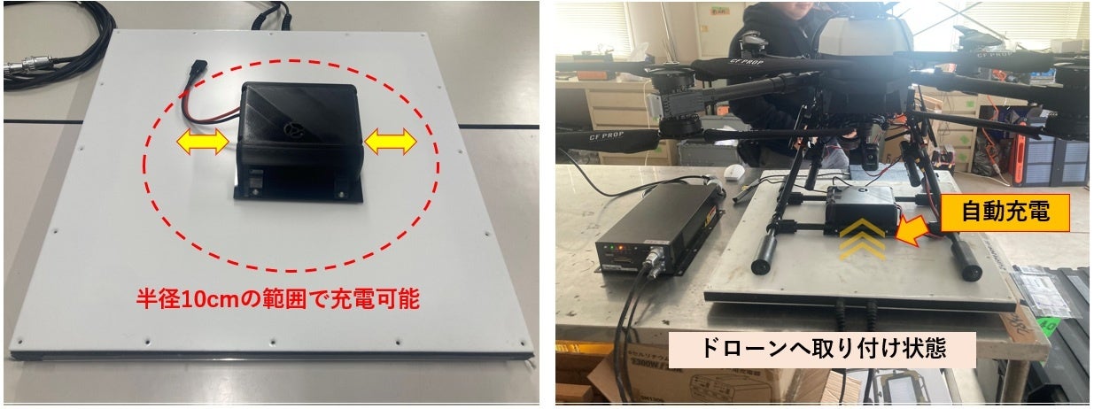 着陸するだけで充電可能、位置ずれ10cmに対応。軽量設計と電波法申請対応で産業ドローンの無人運用を支援
