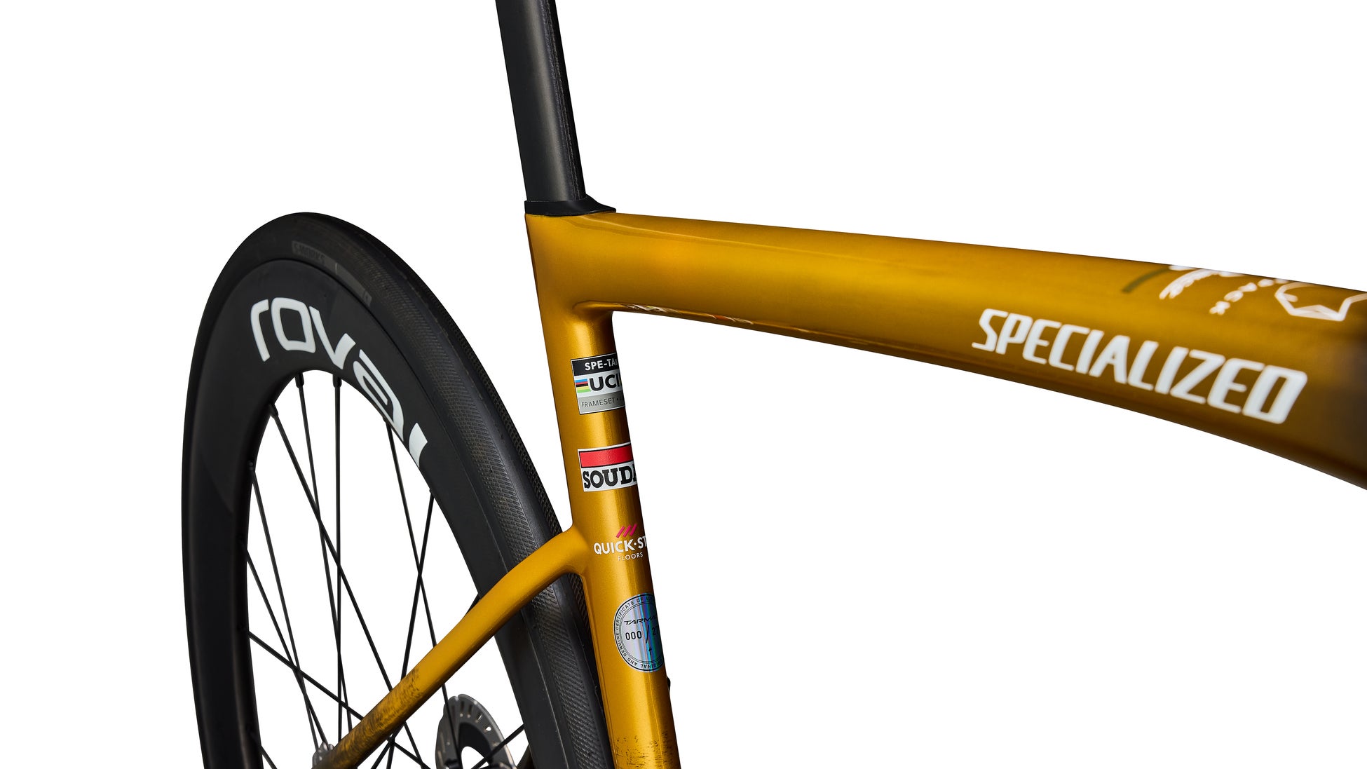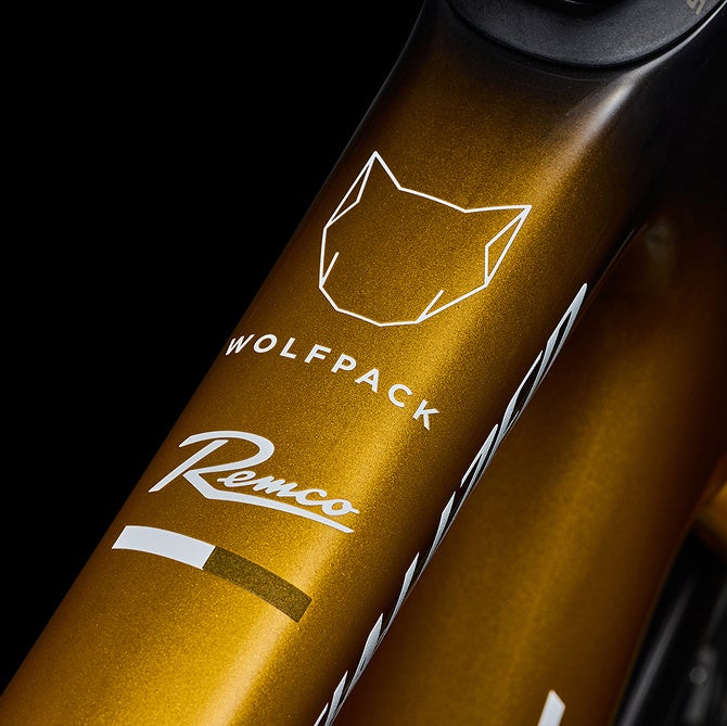 レムコが築いた新しい歴史とスペシャライズドの50周年を記念し、2025シーズンのSoudal Quick-Stepチームグラフィックである「Make the Break」モチーフを、ゴールドにアレンジ。カーボンベースに重ねられたゴールドのツートンが、波のようにシームレスに融合します。トップチューブにはRemcoのロゴとWolfpackのアイコンのほか、若き才能の驚異的な業績を称える白と金のバンドが施されています。