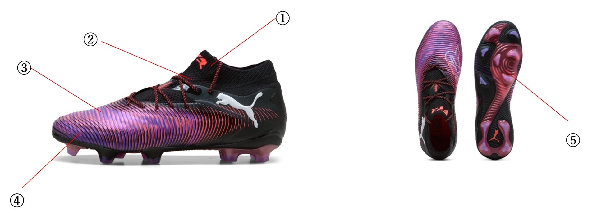 新たに機能がアップデートされた「FUTURE 8 ULTIMATE」は、プーマ独自の「FUZIONFIT³(フュージョンフィット)」テクノロジーが搭載されています。このテクノロジーは、伸縮性の高い「LYCRA®(ライクラ)」とエンジニアードニット素材を組み合わせることで、足全体を包み込むようなフィット感を実現、選手一人ひとりの足形に適応することで、快適性と自由な動きを実現させます。さらに、高密度メッシュと「GripControl Pro(グリップコントロールプロ)」が組み合わさることで、精密なボールコントロールと高いグリップ力が実現し、緻密なプレーが求められる場面でも最大限のサポート力を発揮します。