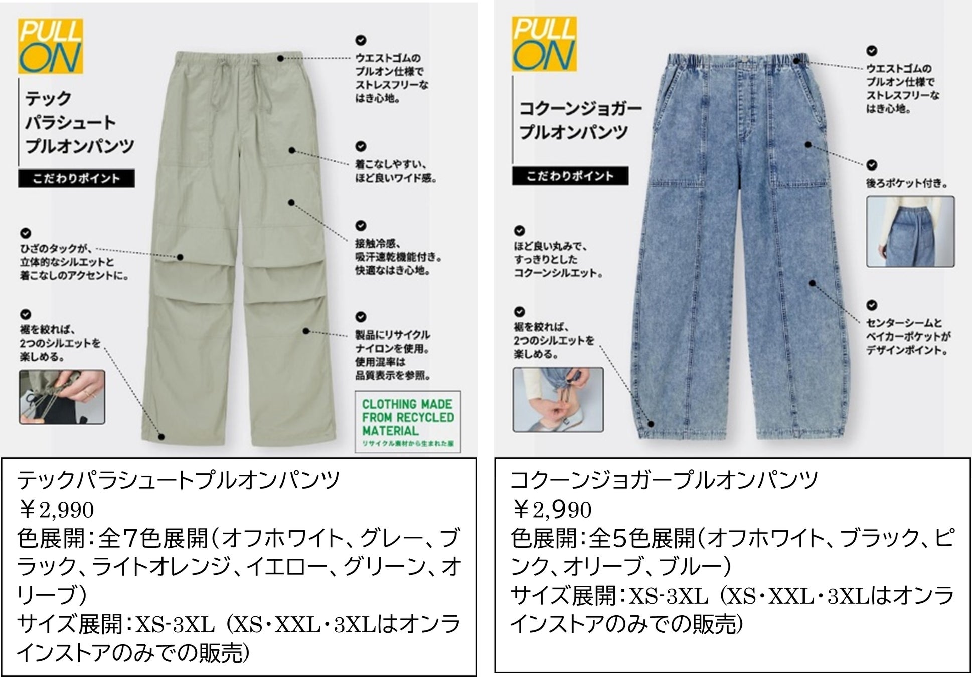 2023年春夏シーズンの登場以来、ウエストゴムでイージーなはき心地と、スタイリングが決まるデザインが人気のプルオンパンツ。今年は、テックパラシュートプルオンパンツ、コクーンジョガープルオンパンツ、リブプルオンパンツ、の3型で展開します。トレンドのユーティリティデザインを取り入れたテックパラシュートプルオンパンツは暑い季節にうれしい接触冷感と吸汗速乾機能付きで快適なはき心地です。コクーンジョガープルオンパンツは、トレンドのコクーンシルエットと、裾を絞ったジョガーシルエット2つのシルエットでお楽しみいただけます。定番のリブプルオンパンツは、柔らかくさらりとはける細リブ素材でイージーなはき心地。シワが目立ちにくく、お手入れが簡単な素材なので旅行など持ち運びにも便利です。