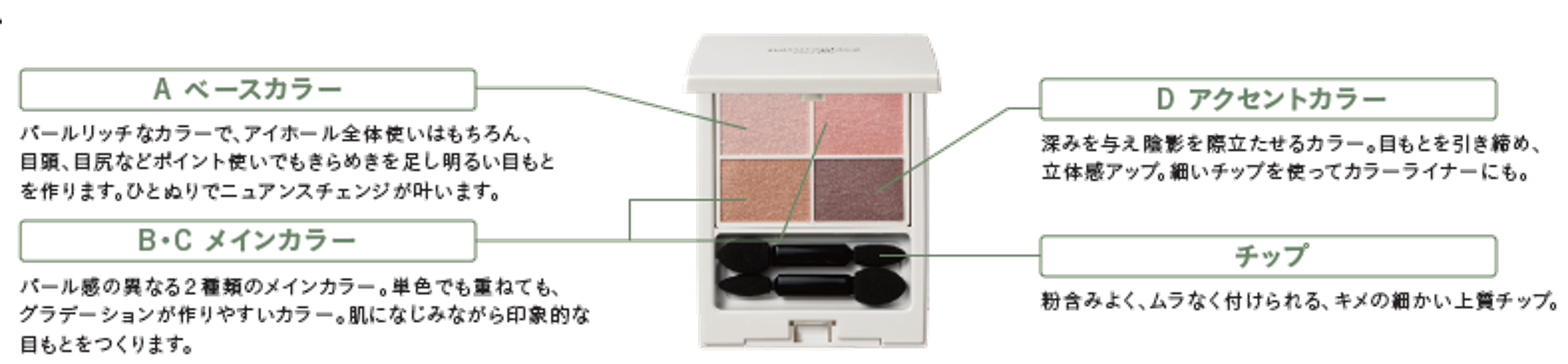 天然ミネラルの絶妙なコンビネーションから生まれたオリジナルベージュを全色のベースに採用。トレンドや肌トーンを問わない4種のアイカラーが、素肌に溶け込みながら自然な陰影を生み出し、上品で印象的な目もとを演出します。