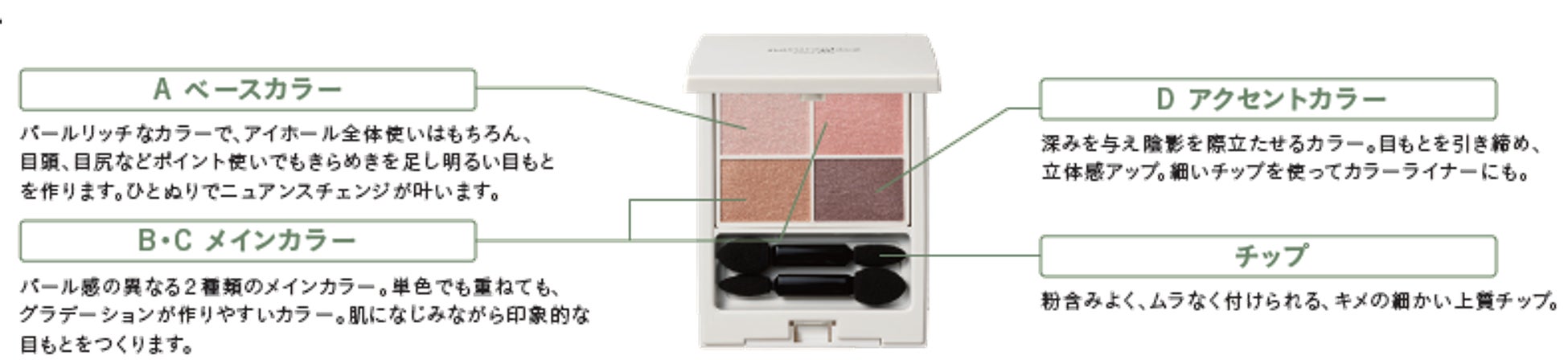 色調・輝きにこだわり、全色に組み合わせの異なる複数のパールを配合しました。繊細な輝きと偏光パールによる多彩なニュアンスで表現する上品なツヤとグラデーションが、大人のまぶたに華やぎと変化を与え、日常のスタンダードメイクを格上げします。