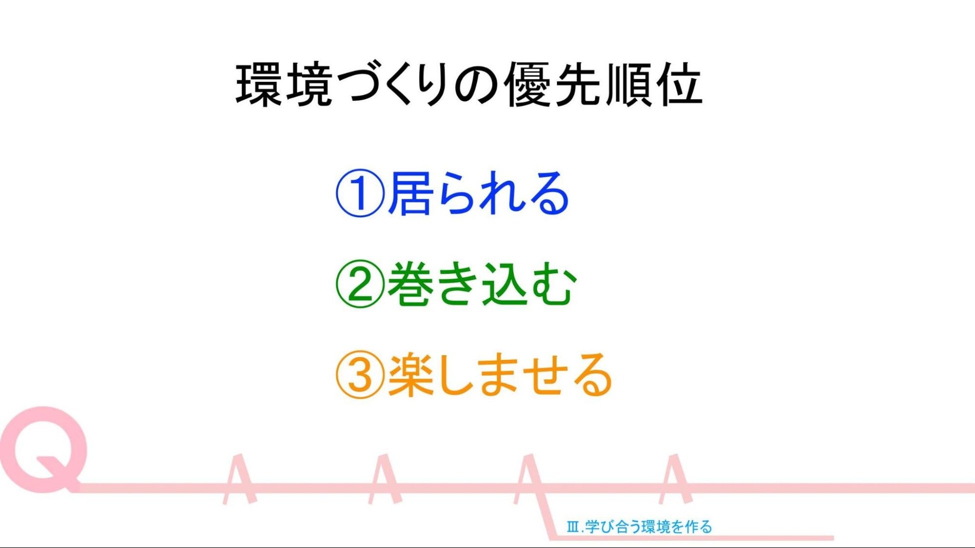 ①居られる:そもそも学びはモチベーションが低くなりがちなので、まずその場に居やすいことが重要。