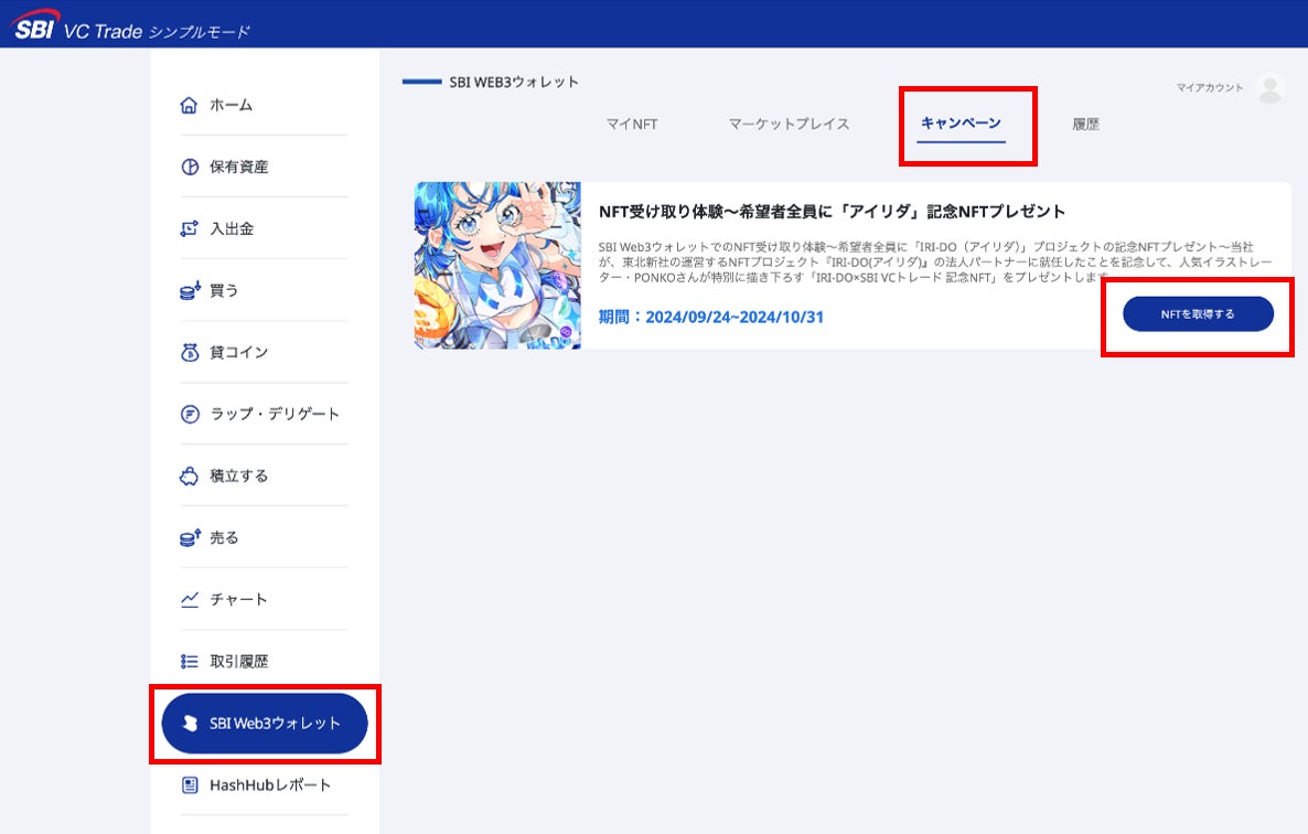 Web版の取引ツール「シンプルモード」にログイン、メニュー「SBI Web3ウォレット」から「キャンペーン」をご選択いただき、「NFTを取得する」ボタンにてお受け取りください。