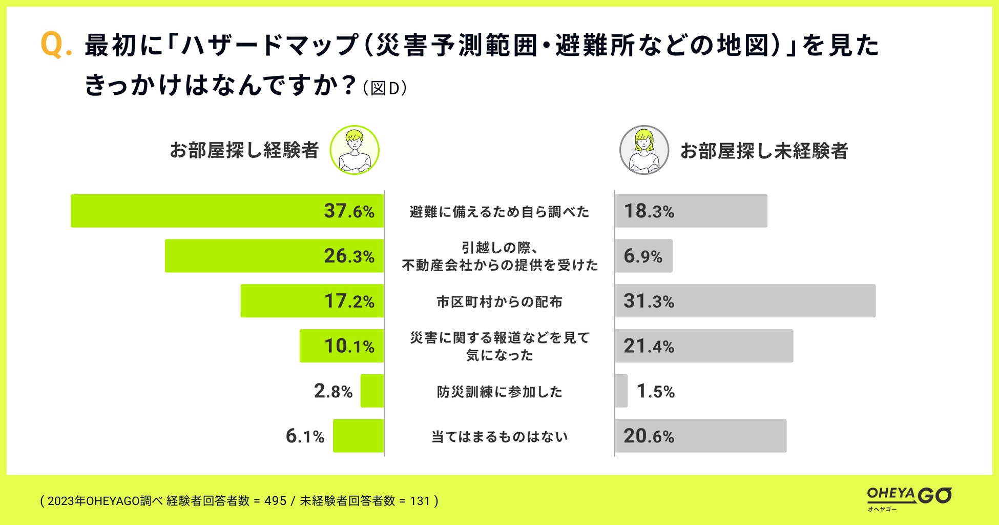 ハザードマップを「見たことがある」人に、最初にハザードマップを見たきっかけについて質問したところ、部屋探し経験者は「避難に備えるため自ら調べた」が37.6%で最も多く、次いで「引越しの際、不動産会社からの提供を受けた」が26.3%、「市区町村からの配布」が17.2%でしたが、部屋探し未経験者は「市区町村からの配布」が31.3%で最も多く、次いで「災害に関する報道などを見て気になった」が21.4%、「避難に備えるため自ら調べた」が18.3%でした。