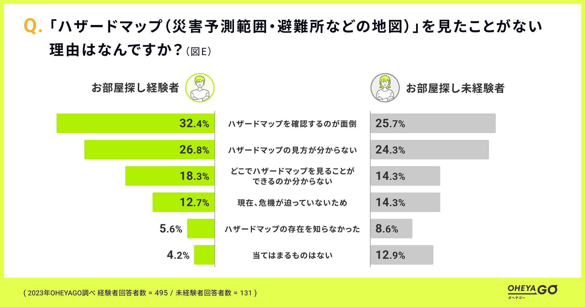 ハザードマップを見ていない理由、部屋探し経験者・未経験者ともに「確認するのが面倒」が1位、「見方がわからない」が2位。ハザードマップの、面倒がなく分かりやすく閲覧できる需要が推測