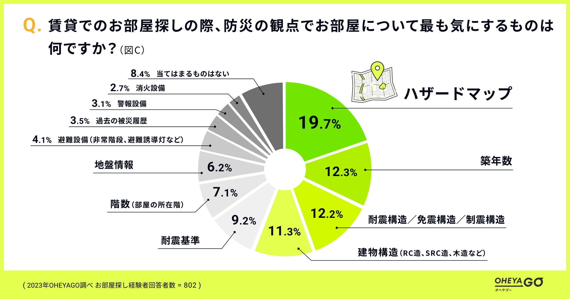 部屋探し経験者に、「部屋探しの際、防災の観点で最も気にするもの」について質問したところ、「ハザードマップ」が19.7%で最も多く、次いで「築年数」が12.3%、「耐震構造/免震構造/制震構造」が12.2%でほぼ同数、「建物構造(RC造、SRC造、木造など)」が11.3%、「耐震基準」が9.2%、「階数(部屋の所在階)」が7.1%でした。「部屋探しの際、防災の観点で最も気にするもの」は人によってばらつきがある結果となりました。(図C)