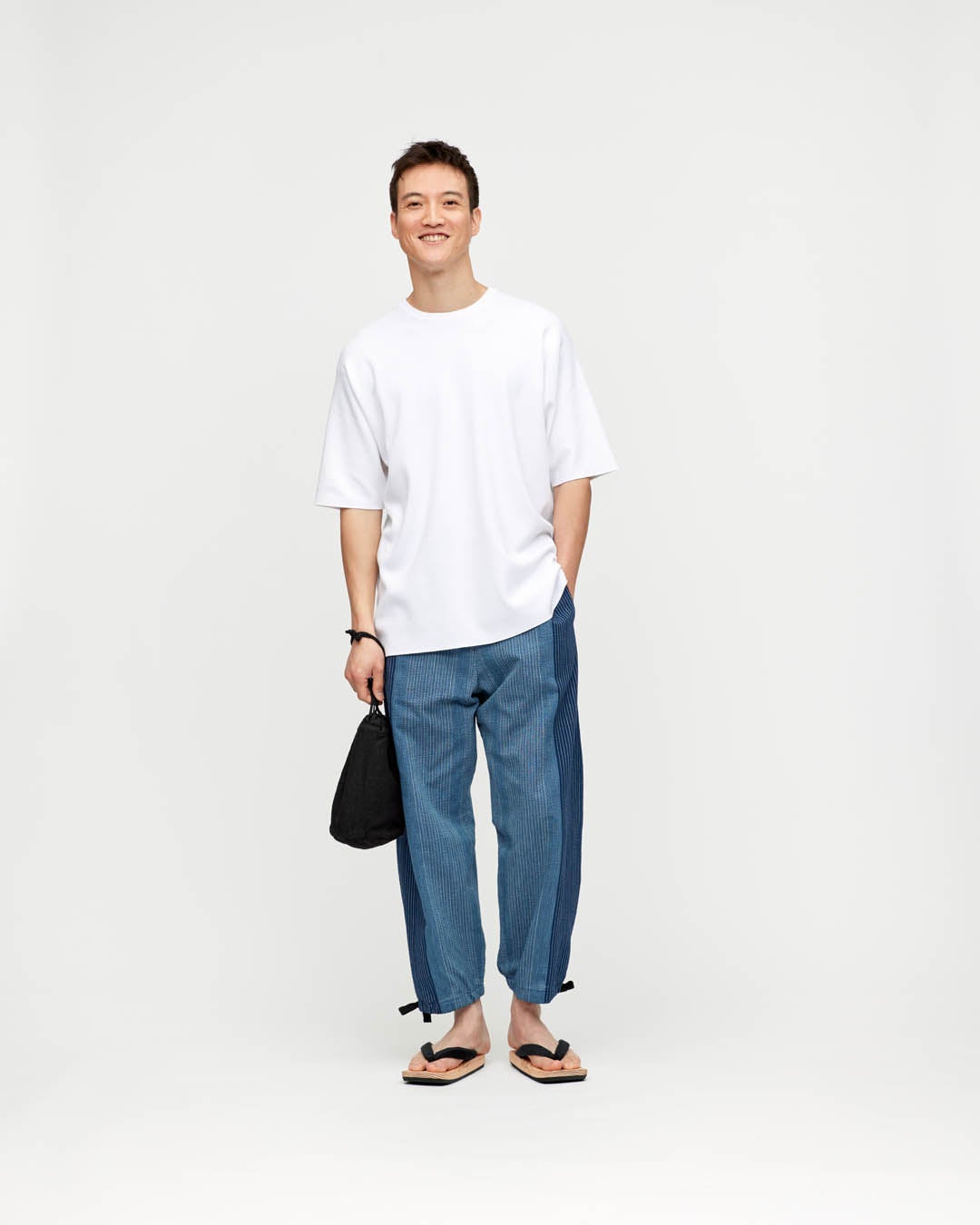 ゆかたの他、毎年好評のゆかた生地を使用したオープンカラーシャツや作務衣のパンツのパターンを活かし、阿波しじらの生地から製作したパンツもラインナップしております。