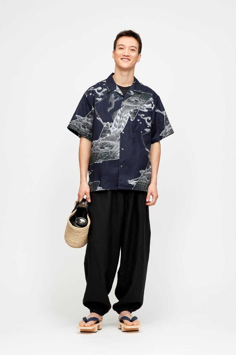 シャツ(左):オープンカラー半袖シャツ / 型染め / 伊藤若冲 / 鷲図 / NAVY